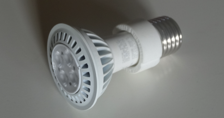 Despite this looking weirdly "long", the overall length and diameter is exactly the same as those stubby 40 spot lights.With that, I could adapt some EcoSmart bulbs and they worked great. Here they are in HomeDepot but with a different packaging than I had them (I bought them in little cardboard boxes, and Amazon doesn’t carry them as I write this). I wish I hadn’t given away the old normal bulb to give you a comparison image – when assembled, the picture of the combined bulb+adapter to the right looks disproportionately long, but the overall length is less than a 1/8th of an inch longer than the original.